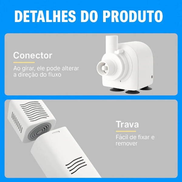 - Filtragem: Possui compartimento para mídias filtrantes (esponja, carvão ativado, etc.).